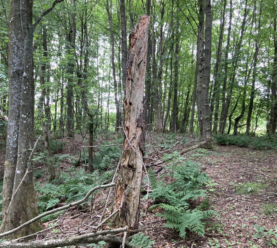 Det udgåede træ på billedet er væltet i en storm i starten af 2023 og ligger nu i skovbunden, hvor det gør nytte for mange forskellige biller og insekter.