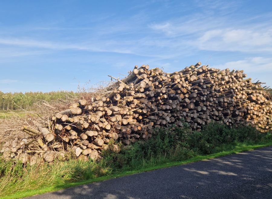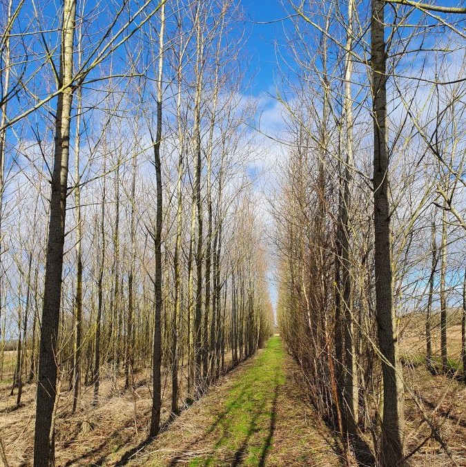 The photo shows energy poplars that were harvested at the beginning of 2025. In the background, you can see the poplars that we left standing. Read below to find out why we did not harvest them all.