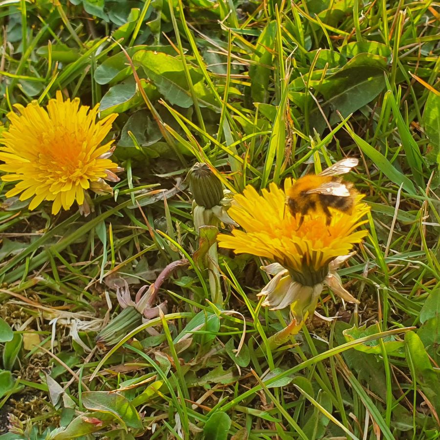 Nederst er det en bi, der i det tidlige forår er på jagt efter nektar.